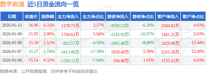 证券之星消息,截至2026年1月12日收盘,数字政通(300075)报收于16.96元,上涨6.33%,换手率7.43%,成交量38.29万手,成交额6.36亿元。