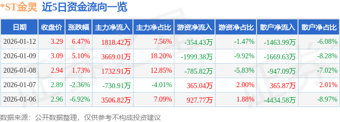 证券之星消息,截至2026年1月12日收盘,*ST金灵(300091)报收于3.29元,上涨6.47%,换手率4.99%,成交量73.67万手,成交额2.41亿元。