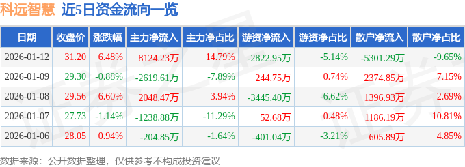 证券之星消息,截至2026年1月12日收盘,科远智慧(002380)报收于31.2元,上涨6.48%,换手率12.72%,成交量18.03万手,成交额5.49亿元。