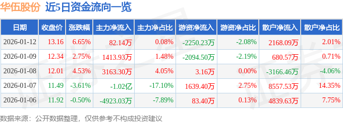 证券之星消息,截至2026年1月12日收盘,华伍股份(300095)报收于13.16元,上涨6.65%,换手率24.93%,成交量84.46万手,成交额10.8亿元。