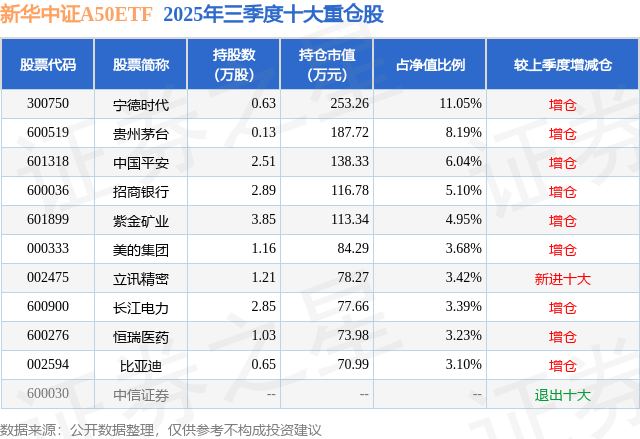 新华中证A50ETF基金成立于2025年3月28日,基金经理为邓岳,基金跟踪标的为中证A50指数,成立以来超额回报为7.29%,近一个月超额回报为0.08%。最新披露的基金持仓数据显示,截止2025年9月30日,该基金第一大重仓股为宁德时代(300750),持股占比为11.05%。
