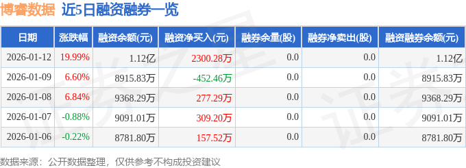 证券之星消息,截至2026年1月12日收盘,博睿数据(688229)报收于87.26元,上涨19.99%,涨停,换手率10.72%,成交量4.76万手,成交额3.89亿元。