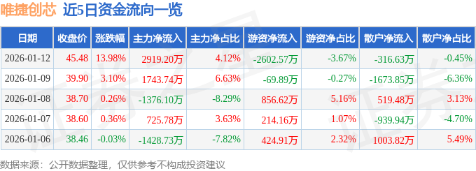 证券之星消息,截至2026年1月12日收盘,唯捷创芯(688153)报收于45.48元,上涨13.98%,换手率3.93%,成交量16.06万手,成交额7.09亿元。