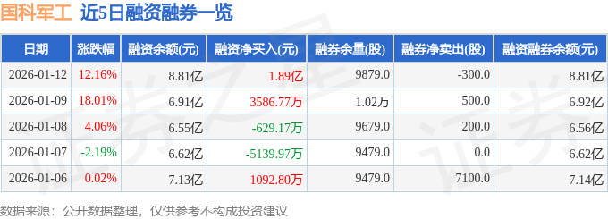 国科军工融资融券信息显示,融资方面,当日融资买入4.2亿元,融资偿还2.31亿元,融资净买入1.89亿元,净买入额两市排名第19。融券方面,融券卖出400.0股,融券偿还700.0股,融券余量9879.0股,融券余额82.77万元。融资融券余额8.81亿元。