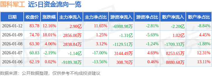 证券之星消息,截至2026年1月12日收盘,国科军工(688543)报收于83.78元,上涨12.16%,换手率27.05%,成交量31.36万手,成交额24.87亿元。