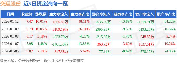 证券之星消息,截至2026年1月12日收盘,交运股份(600676)报收于7.47元,上涨10.01%,已连续涨停2天,换手率0.5%,成交量5.16万手,成交额3857.52万元。