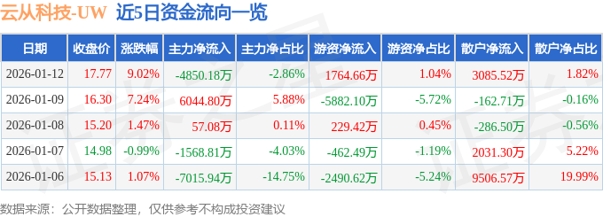 证券之星消息,截至2026年1月12日收盘,云从科技(688327)报收于17.77元,上涨9.02%,换手率11.79%,成交量98.24万手,成交额16.93亿元。