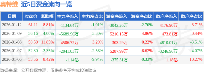 证券之星消息,截至2026年1月12日收盘,奥特维(688516)报收于61.11元,上涨8.81%,换手率5.82%,成交量18.3万手,成交额11.26亿元。
