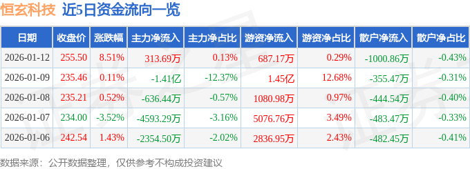 证券之星消息,截至2026年1月12日收盘,恒玄科技(688608)报收于255.5元,上涨8.51%,换手率5.6%,成交量9.45万手,成交额23.46亿元。