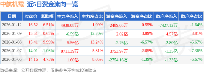 证券之星消息,截至2026年1月12日收盘,中航机载(600372)报收于16.52元,上涨6.51%,换手率5.7%,成交量275.88万手,成交额45.31亿元。
