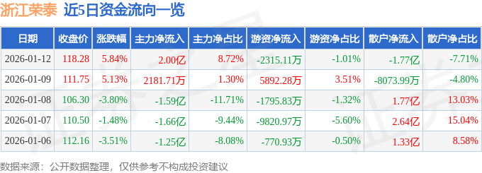 证券之星消息,截至2026年1月12日收盘,浙江荣泰(603119)报收于118.28元,上涨5.84%,换手率9.75%,成交量19.87万手,成交额22.91亿元。