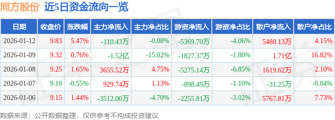 证券之星消息,截至2026年1月12日收盘,同方股份(600100)报收于9.83元,上涨5.47%,换手率4.09%,成交量137.09万手,成交额13.21亿元。