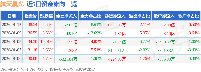 证券之星消息,截至2026年1月12日收盘,航天晨光(600501)报收于38.54元,上涨5.33%,换手率19.01%,成交量81.33万手,成交额30.81亿元。
