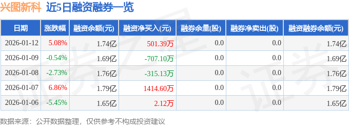 兴图新科融资融券信息显示,融资方面,当日融资买入3897.75万元,融资偿还3396.36万元,融资净买入501.39万元。融券方面,融券卖出0.0股,融券偿还0.0股,融券余量0.0股,融券余额0.0万元。融资融券余额1.74亿元。
