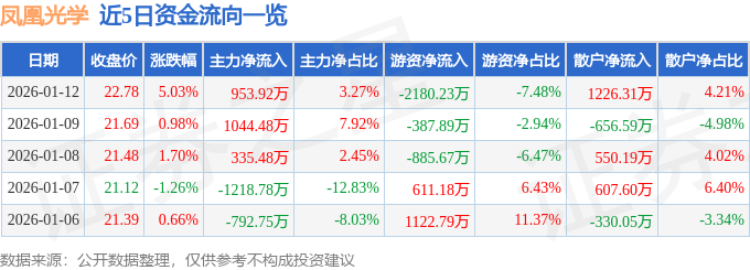 证券之星消息,截至2026年1月12日收盘,凤凰光学(600071)报收于22.78元,上涨5.03%,换手率4.6%,成交量12.95万手,成交额2.91亿元。
