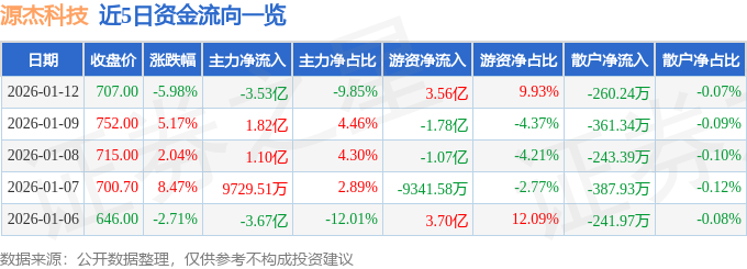 证券之星消息,截至2026年1月12日收盘,源杰科技(688498)报收于707.0元,下跌5.98%,换手率5.96%,成交量5.01万手,成交额35.84亿元。