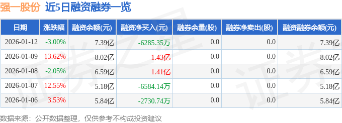 强一股份融资融券信息显示,融资方面,当日融资买入2.82亿元,融资偿还3.45亿元,融资净偿还6285.35万元。融券方面,融券卖出0.0股,融券偿还0.0股,融券余量0.0股,融券余额0.0万元。融资融券余额7.39亿元。