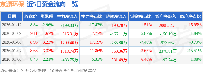证券之星消息,截至2026年1月12日收盘,京源环保(688096)报收于8.84元,下跌2.96%,换手率5.99%,成交量14.15万手,成交额1.26亿元。