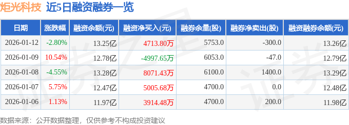 炬光科技融资融券信息显示,融资方面,当日融资买入1.36亿元,融资偿还8902.87万元,融资净买入4713.8万元。融券方面,融券卖出1500.0股,融券偿还1800.0股,融券余量5753.0股,融券余额114.17万元。融资融券余额13.26亿元。