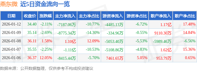 证券之星消息,截至2026年1月12日收盘,燕东微(688172)报收于34.4元,下跌2.11%,换手率2.5%,成交量19.49万手,成交额6.68亿元。