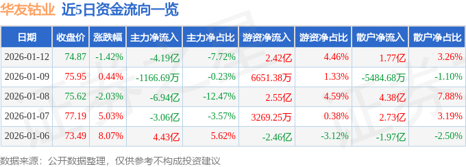 1月12日的资金流向数据方面,主力资金净流出4.19亿元,占总成交额7.72%,游资资金净流入2.42亿元,占总成交额4.46%,散户资金净流入1.77亿元,占总成交额3.26%。