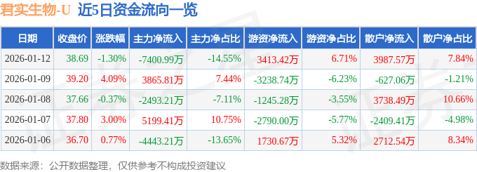 证券之星消息,截至2026年1月12日收盘,君实生物(688180)报收于38.69元,下跌1.3%,换手率1.72%,成交量13.15万手,成交额5.09亿元。