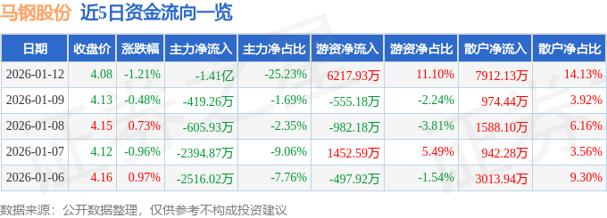 证券之星消息,截至2026年1月12日收盘,马钢股份(600808)报收于4.08元,下跌1.21%,换手率2.31%,成交量138.02万手,成交额5.6亿元。