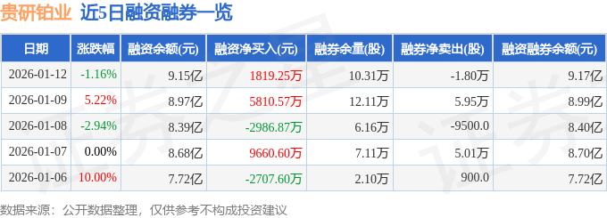 贵研铂业融资融券信息显示,融资方面,当日融资买入1.99亿元,融资偿还1.8亿元,融资净买入1819.25万元。融券方面,融券卖出2.06万股,融券偿还3.86万股,融券余量10.31万股,融券余额219.81万元。融资融券余额9.17亿元。