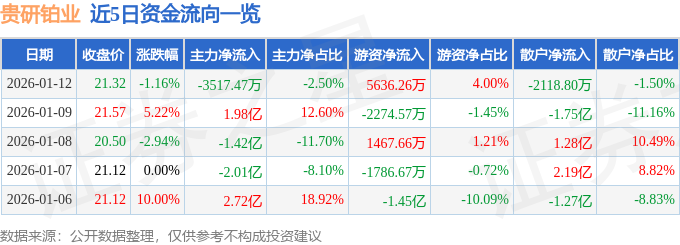 1月12日的资金流向数据方面,主力资金净流出3517.47万元,占总成交额2.5%,游资资金净流入5636.26万元,占总成交额4.0%,散户资金净流出2118.8万元,占总成交额1.5%。