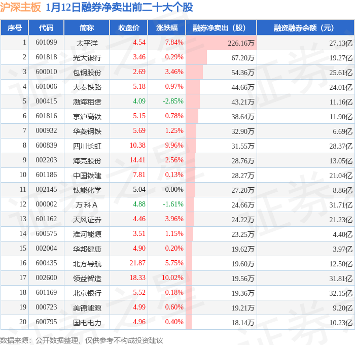 沪深主板融券净卖出前三分别为:太平洋(601099)融券净卖出226.16万股、光大银行(601818)融券净卖出67.2万股、包钢股份(600010)融券净卖出54.36万股,前20具体见下表: