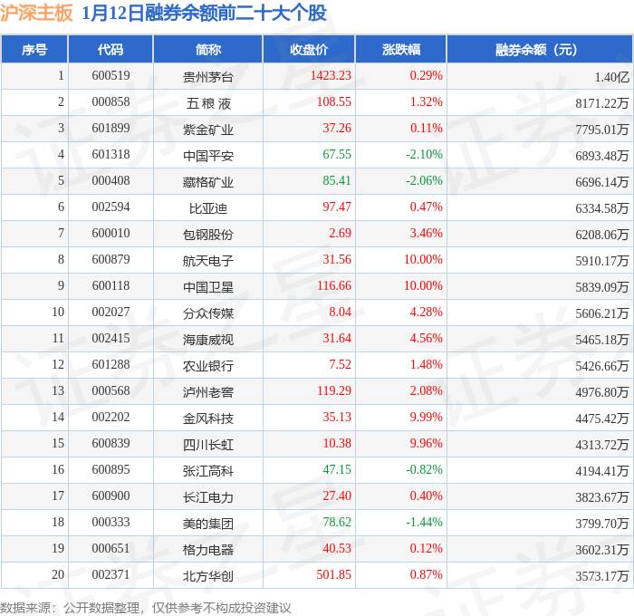 沪深主板融券余额前三分别为:贵州茅台(600519)融券余额1.4亿元、五 粮 液(000858)融券余额8171.22万元、紫金矿业(601899)融券余额7795.01万元,前20具体见下表: