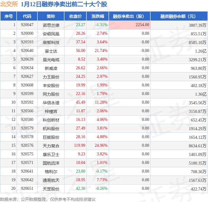北交所融券净卖出前三分别为:诺思兰德(920047)融券净卖出2254股,前20具体见下表: