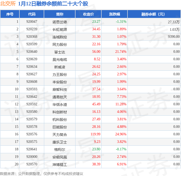 北交所融券余额前三分别为:诺思兰德(920047)融券余额27.33万元、长虹能源(920239)融券余额1.03万元、连城数控(920368)融券余额9390元,前20具体见下表: