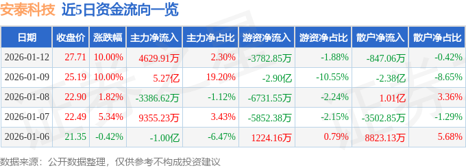 证券之星消息,截至2026年1月12日收盘,安泰科技(000969)报收于27.71元,上涨10.0%,已连续涨停2天,换手率7.11%,成交量73.5万手,成交额20.13亿元。