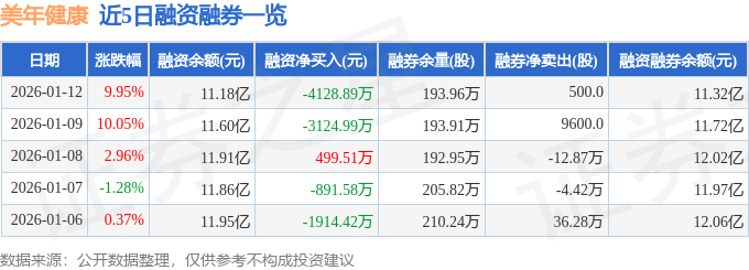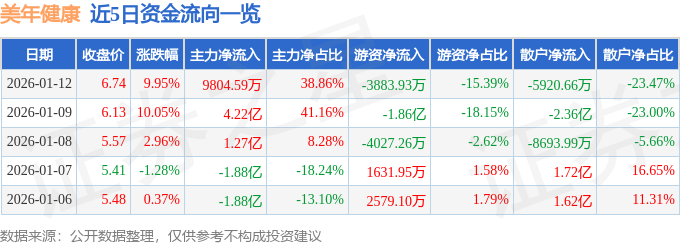 证券之星消息,截至2026年1月12日收盘,美年健康(002044)报收于6.74元,上涨9.95%,已连续涨停2天,换手率0.97%,成交量37.43万手,成交额2.52亿元。