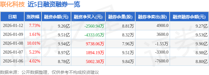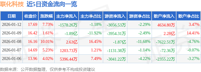 证券之星消息,截至2026年1月12日收盘,联化科技(002250)报收于17.69元,上涨7.73%,换手率8.42%,成交量75.37万手,成交额13.35亿元。