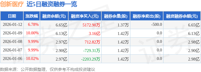 创新医疗融资融券信息显示,融资方面,当日融资买入5.92亿元,融资偿还5.4亿元,融资净买入5172.9万元,连续3日净买入累计3.75亿元。融券方面,融券卖出0.0股,融券偿还500.0股,融券余量1.37万股,融券余额50.68万元。融资融券余额6.65亿元。