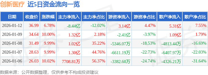 证券之星消息,截至2026年1月12日收盘,创新医疗(002173)报收于36.99元,上涨6.78%,换手率46.32%,成交量192.83万手,成交额70.25亿元。
