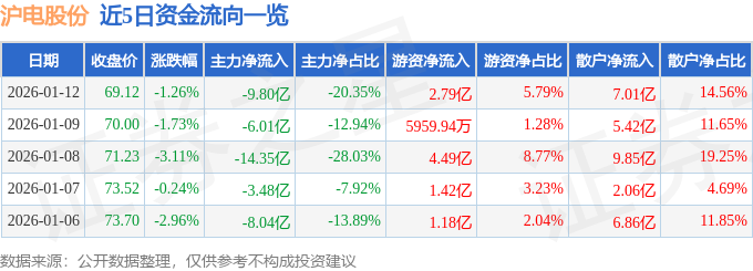 证券之星消息,截至2026年1月12日收盘,沪电股份(002463)报收于69.12元,下跌1.26%,换手率3.65%,成交量70.21万手,成交额48.15亿元。
