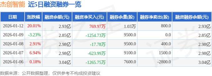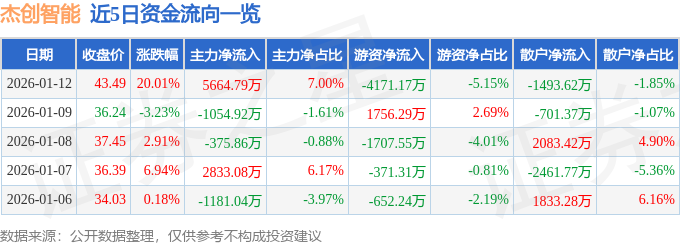 证券之星消息,截至2026年1月12日收盘,杰创智能(301248)报收于43.49元,上涨20.01%,涨停,换手率17.84%,成交量20.04万手,成交额8.09亿元。