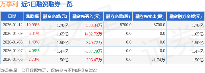 证券之星消息,截至2026年1月12日收盘,万事利(301066)报收于25.27元,上涨19.99%,涨停,换手率12.78%,成交量24.12万手,成交额5.6亿元。