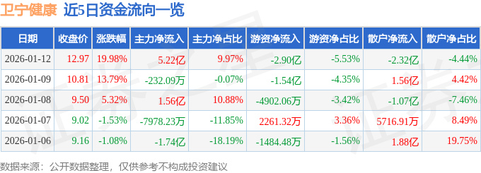 证券之星消息,截至2026年1月12日收盘,卫宁健康(300253)报收于12.97元,上涨19.98%,涨停,换手率23.49%,成交量428.52万手,成交额52.35亿元。