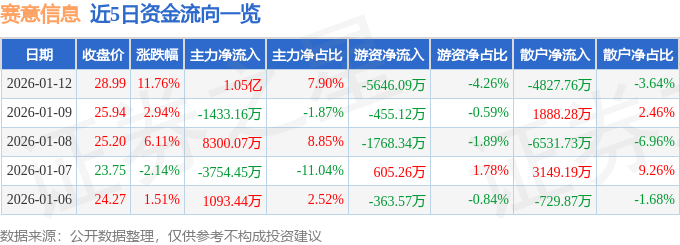 证券之星消息,截至2026年1月12日收盘,赛意信息(300687)报收于28.99元,上涨11.76%,换手率14.46%,成交量47.58万手,成交额13.26亿元。
