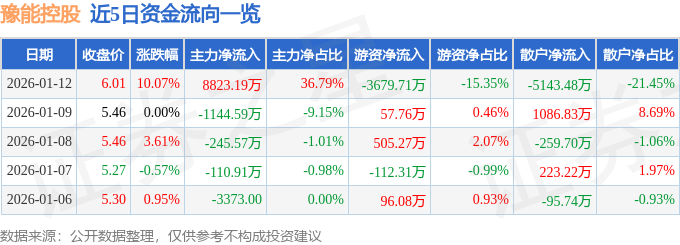 证券之星消息,截至2026年1月12日收盘,豫能控股(001896)报收于6.01元,上涨10.07%,涨停,换手率2.66%,成交量40.61万手,成交额2.4亿元。