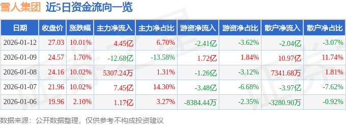 证券之星消息,截至2026年1月12日收盘,雪人集团(002639)报收于27.03元,上涨10.01%,涨停,换手率40.08%,成交量260.76万手,成交额66.49亿元。