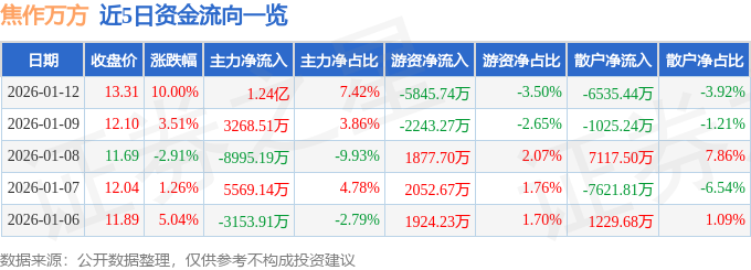 证券之星消息,截至2026年1月12日收盘,焦作万方(000612)报收于13.31元,上涨10.0%,涨停,换手率10.85%,成交量129.27万手,成交额16.69亿元。