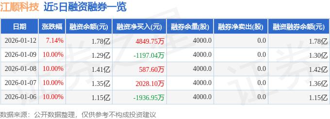 江顺科技融资融券信息显示,融资方面,当日融资买入1.18亿元,融资偿还6932.49万元,融资净买入4849.75万元。融券方面,融券卖出400.0股,融券偿还400.0股,融券余量4000.0股,融券余额48.68万元。融资融券余额1.78亿元。