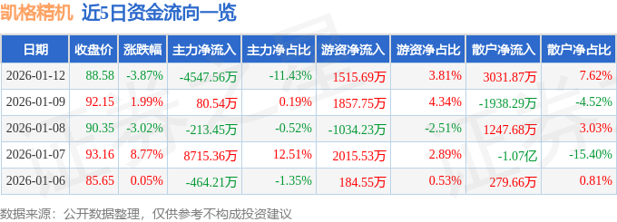 证券之星消息,截至2026年1月12日收盘,凯格精机(301338)报收于88.58元,下跌3.87%,换手率7.58%,成交量4.49万手,成交额3.98亿元。