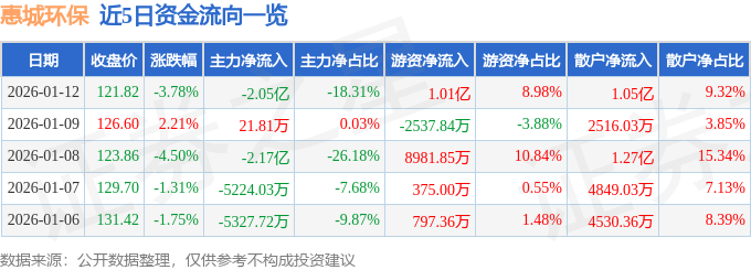 证券之星消息,截至2026年1月12日收盘,惠城环保(300779)报收于121.82元,下跌3.78%,换手率5.72%,成交量9.22万手,成交额11.22亿元。
