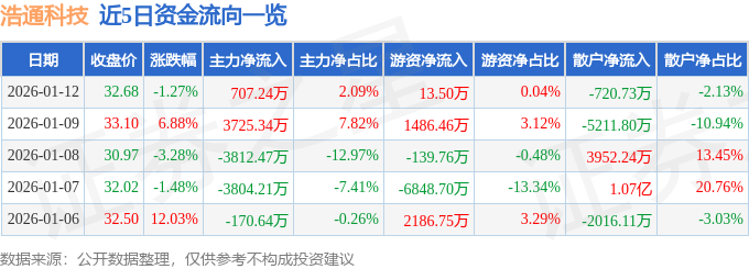 证券之星消息,截至2026年1月12日收盘,浩通科技(301026)报收于32.68元,下跌1.27%,换手率9.27%,成交量10.35万手,成交额3.38亿元。